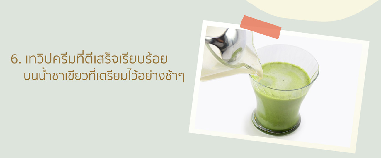 - ตกแต่งด้วยฟองนมและผงชาเขียวด้านบน